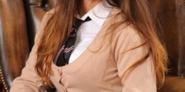 Brunette schoolgirl Louisa Marie doffs her short skirt and poses in pantyhose